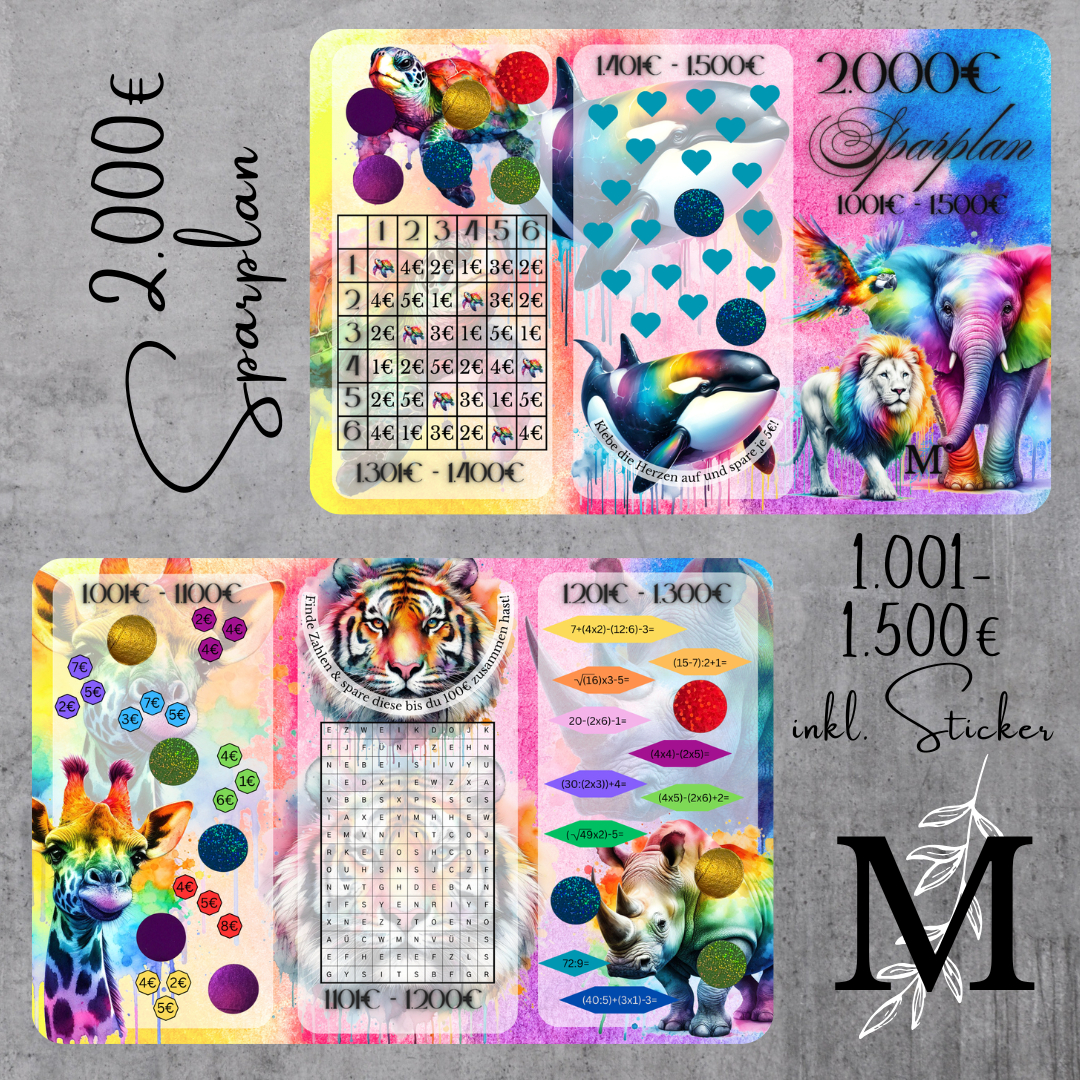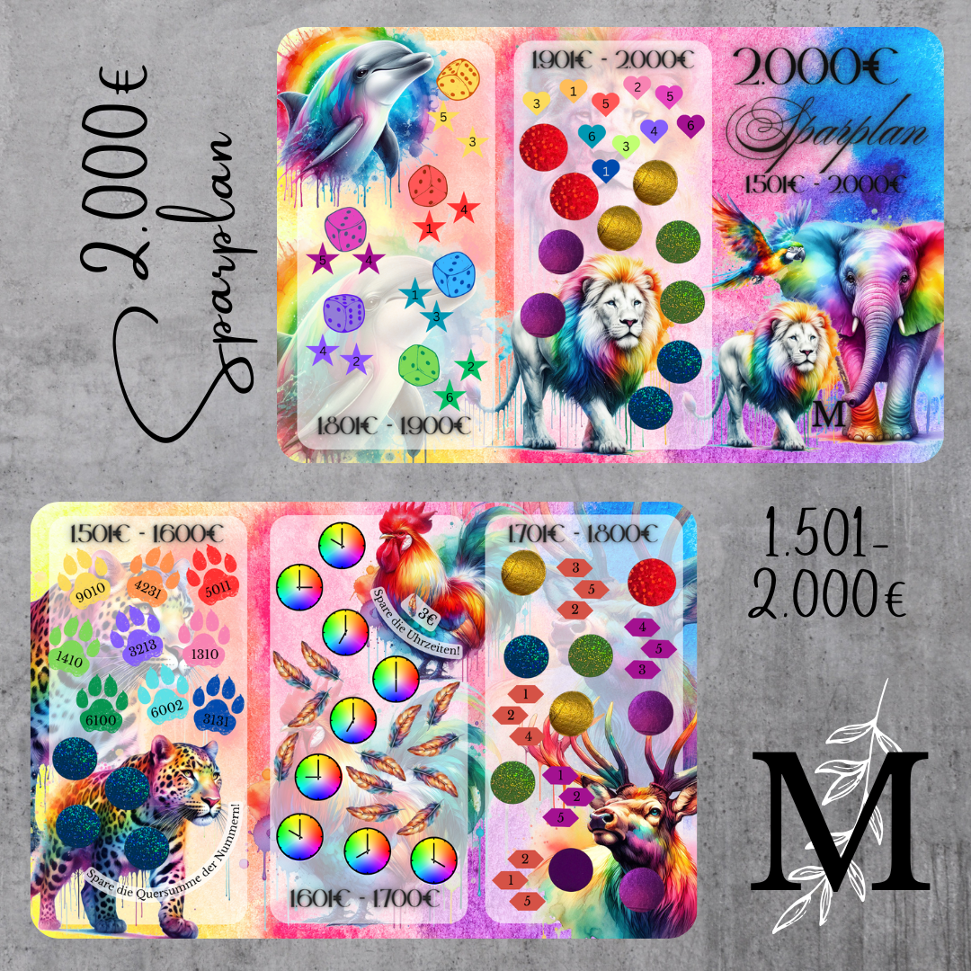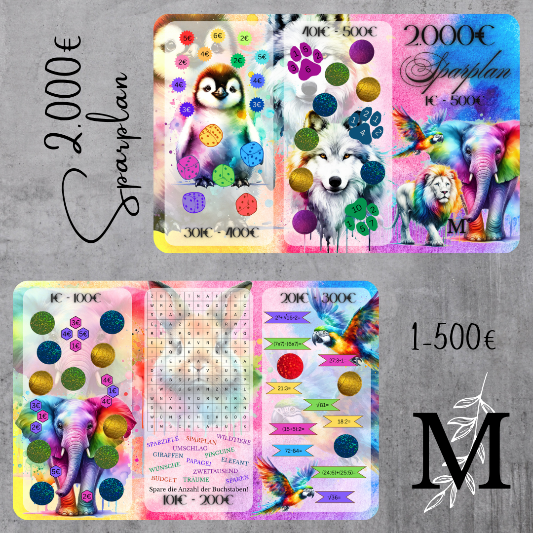 Mit jeder Klappkarte werden 500 Euro gespart. Pro Seite 100 Euro. Hier habt ihr die Möglichkeit mit kleinen Sparbeträgen ein großes Ziel zu erreichen. Durch die bunten Farben geht der Spaß nie verloren =).