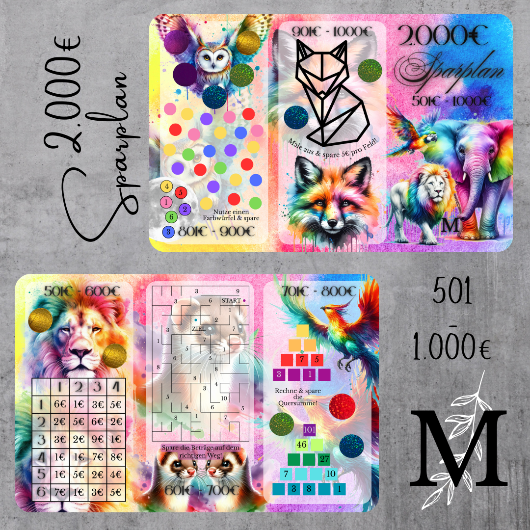 Das Sparspiel „2.000 Euro Sparplan“ kommt mit 4 Dreierklappkarten und einem folierten Deckblatt.