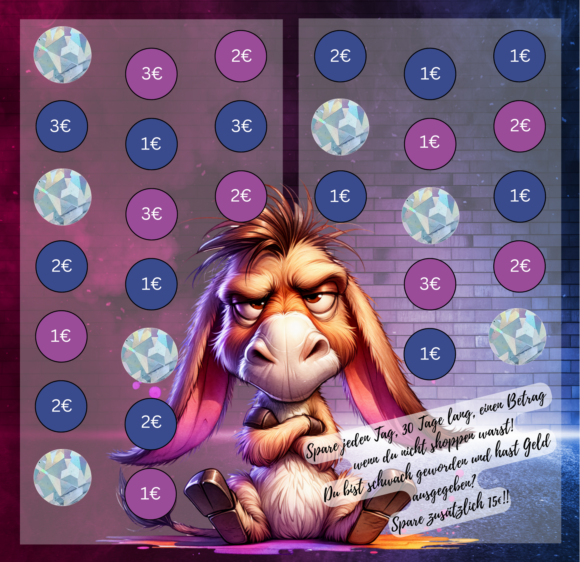 Spare jeden Tag, 30 Tage lang, einen Betrag wenn du nicht shoppen warst! Du bist schwach geworden und hast Geld ausgegeben? Spare jeweils zusätzlich 15 Euro!!