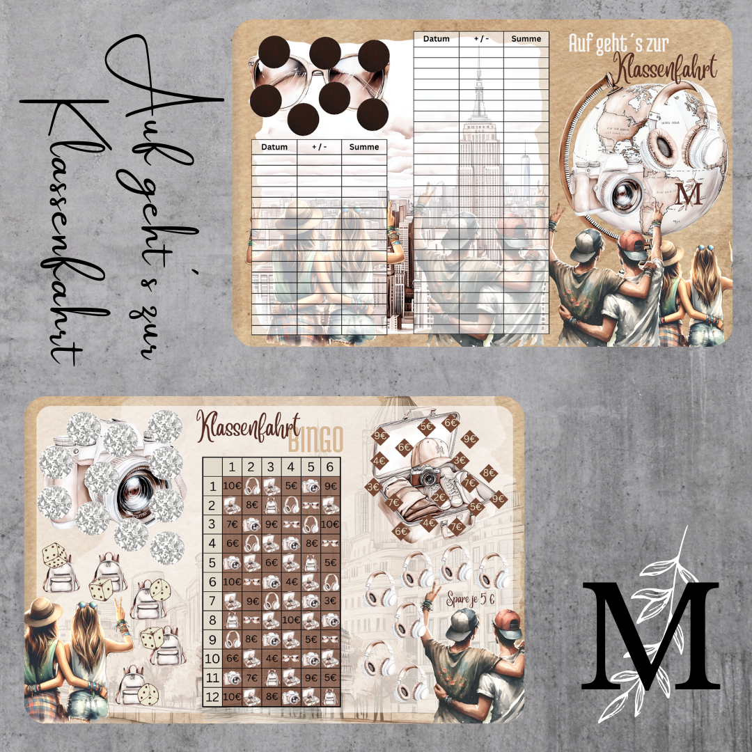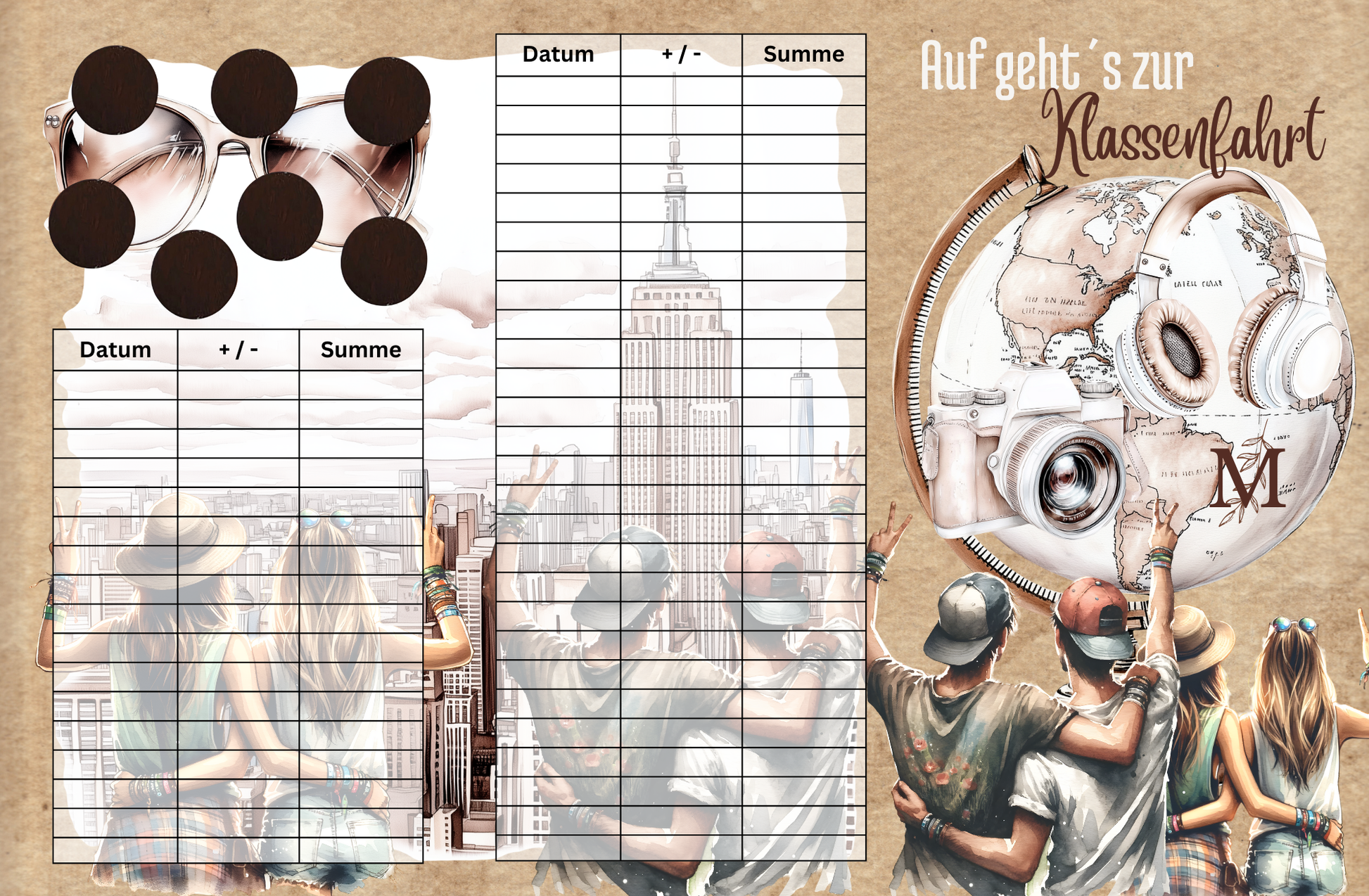 Die „Auf geht's zur Klassenfahrt“ Sparchallenge ist eine Dreierklappkarte.