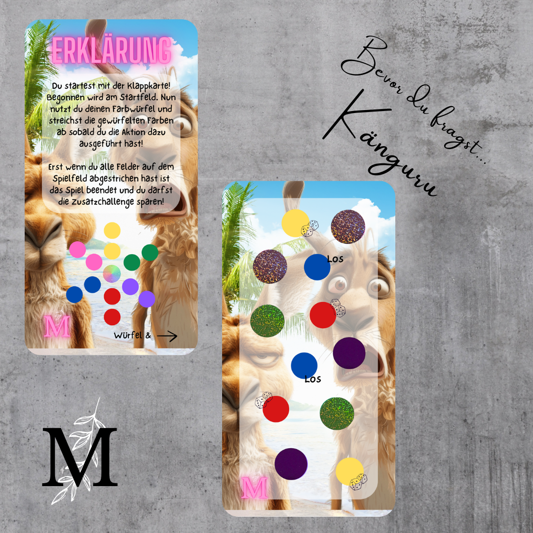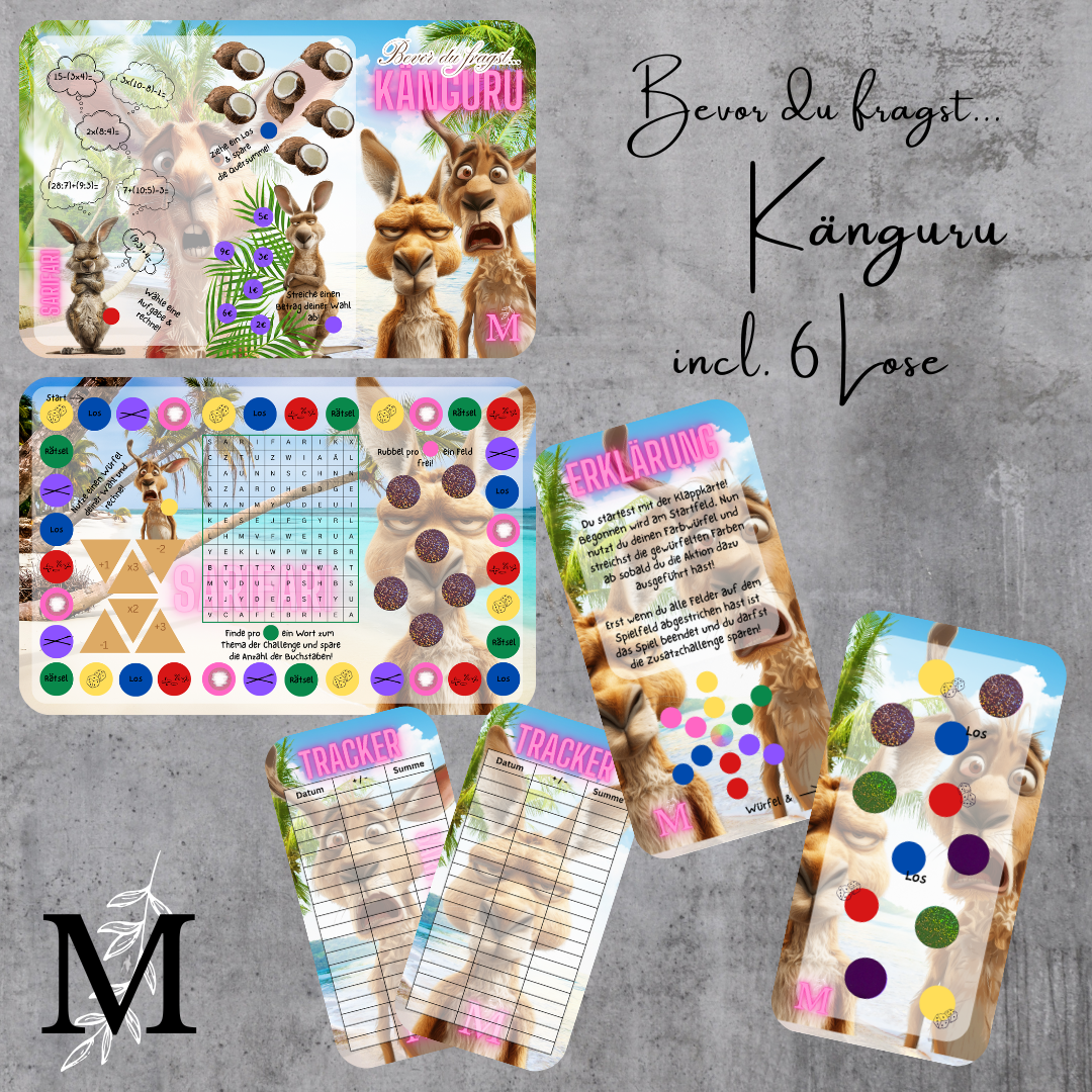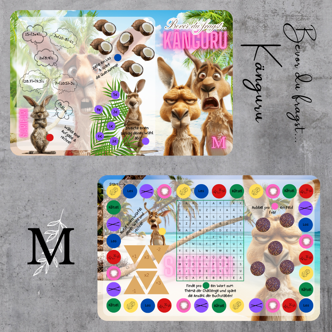 Das Sparspiel „Bevor du fragst… Känguru“ ist eine Dreierklappkarte, bei der Ihr dem Spielfeld folgen müsst. Pro Feld habt ihr verschiedene Aufgaben zu lösen. Hier könnt ihr Rubbeln, Sparen, Rechnen, Rätseln, Lose ziehen und Würfeln.