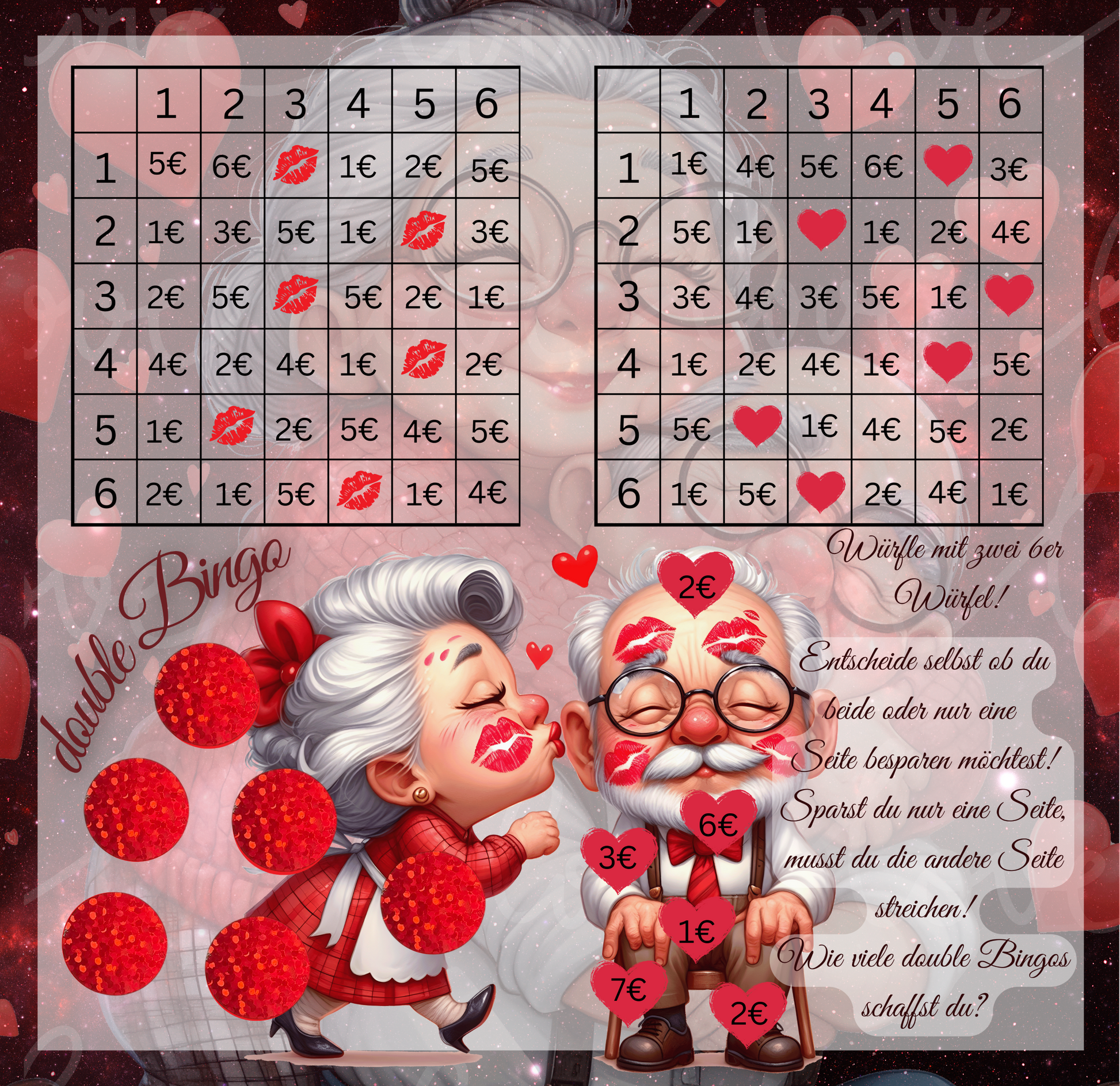 Entscheide selbst ob du beide oder nur eine Seite besparen möchtest! Sparst du nur eine Seite, musst du die andere Seite streichen! Wie viele double Bingos schaffst du?