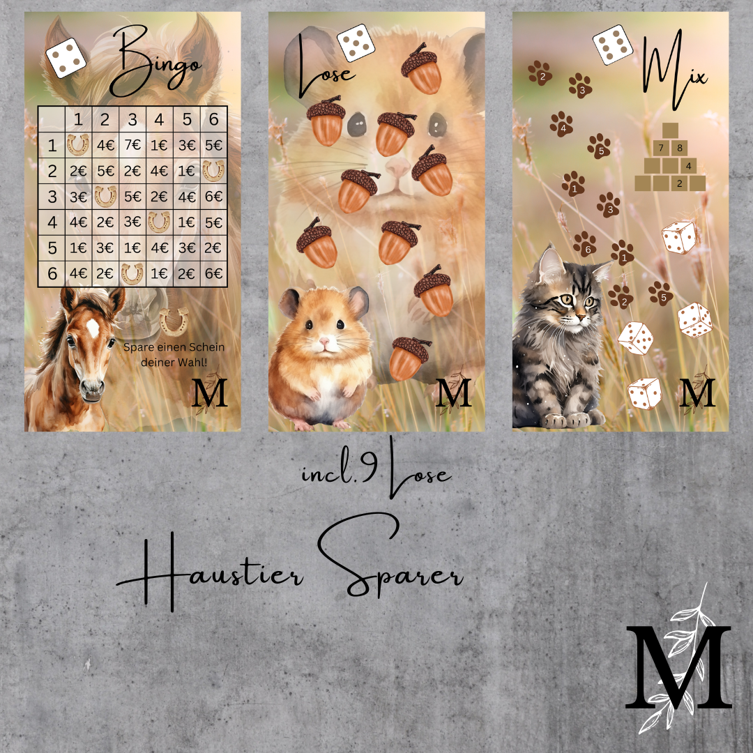 Das Sparspiel kommt mit einem passenden Tracker (Vorder- und Rückseite bedruckt) und 3 Karten je vorne und hinten bedruckt, sowie 9 passende Lose.