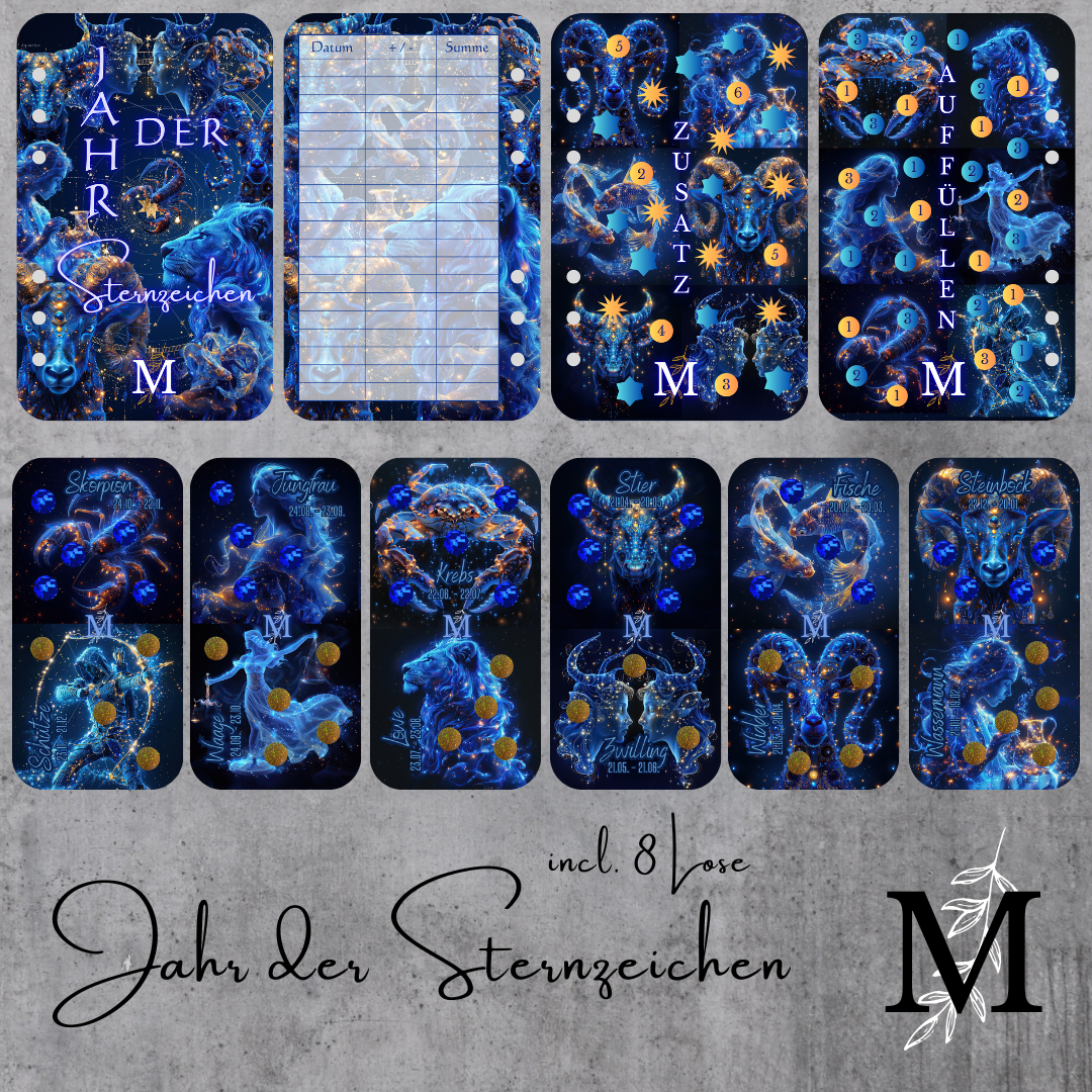 Das Sparspiel „Jahr der Sternzeichen“ kommt mit 3 doppelseitig bedruckten Karten.