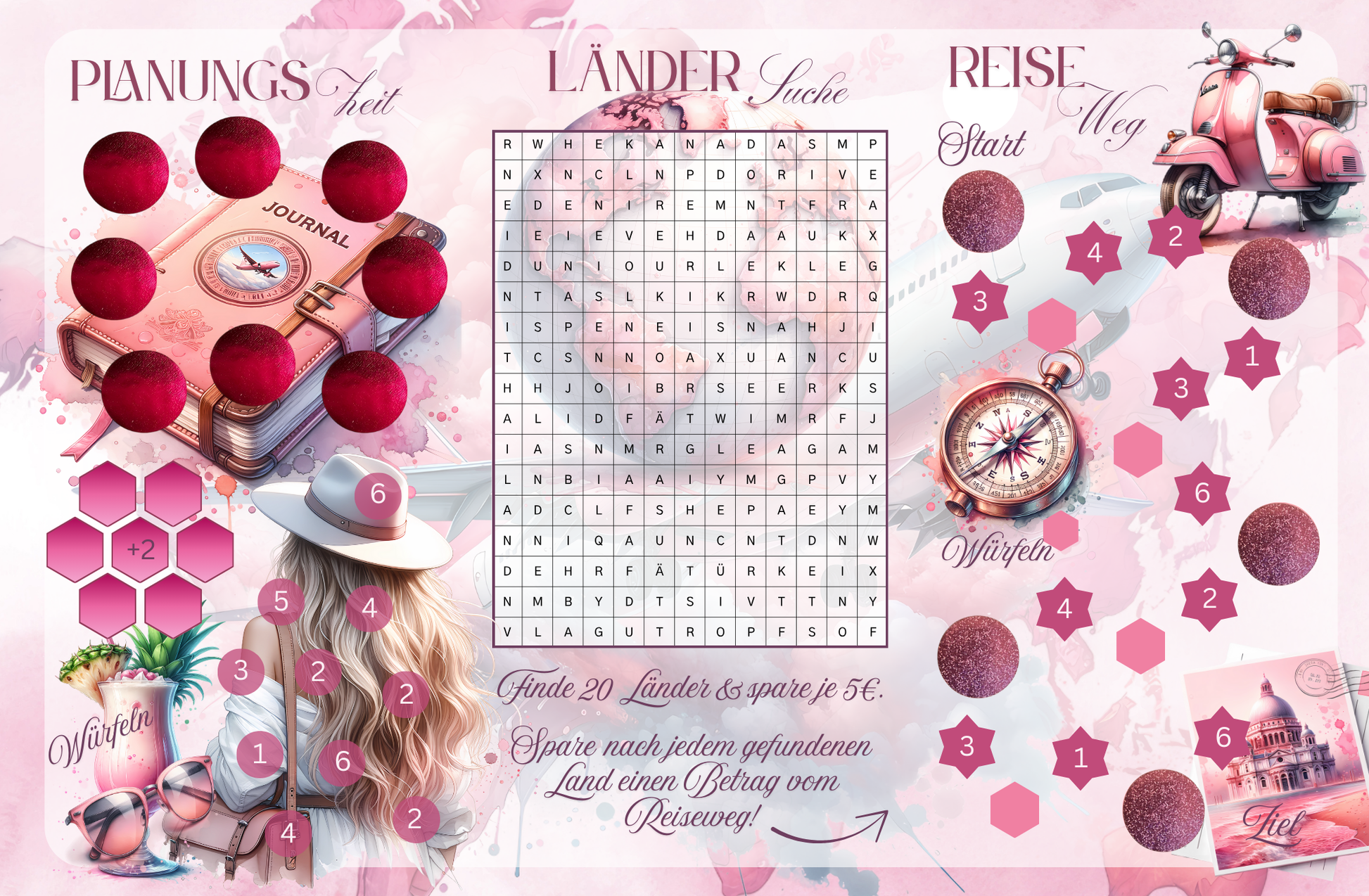 Ihr habt auf der Innenseite unterschiedliche Challenges: abstreichen, rubbeln, würfeln, Ländersuche.