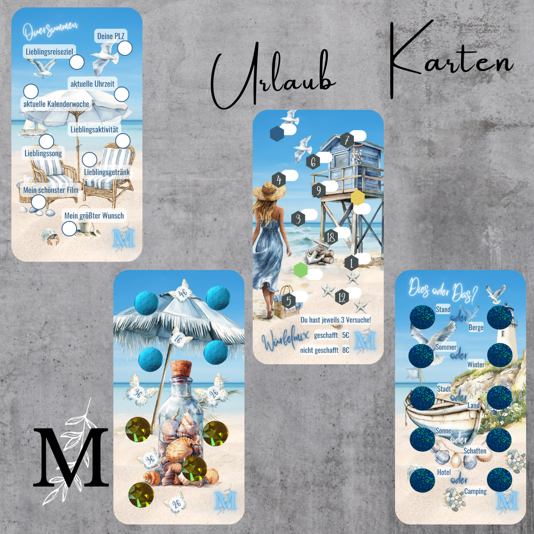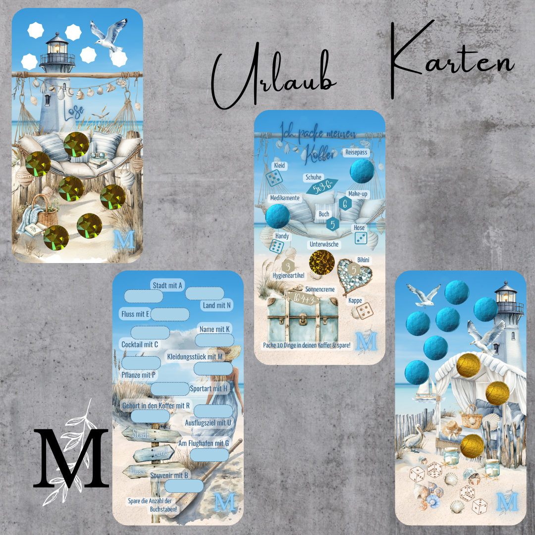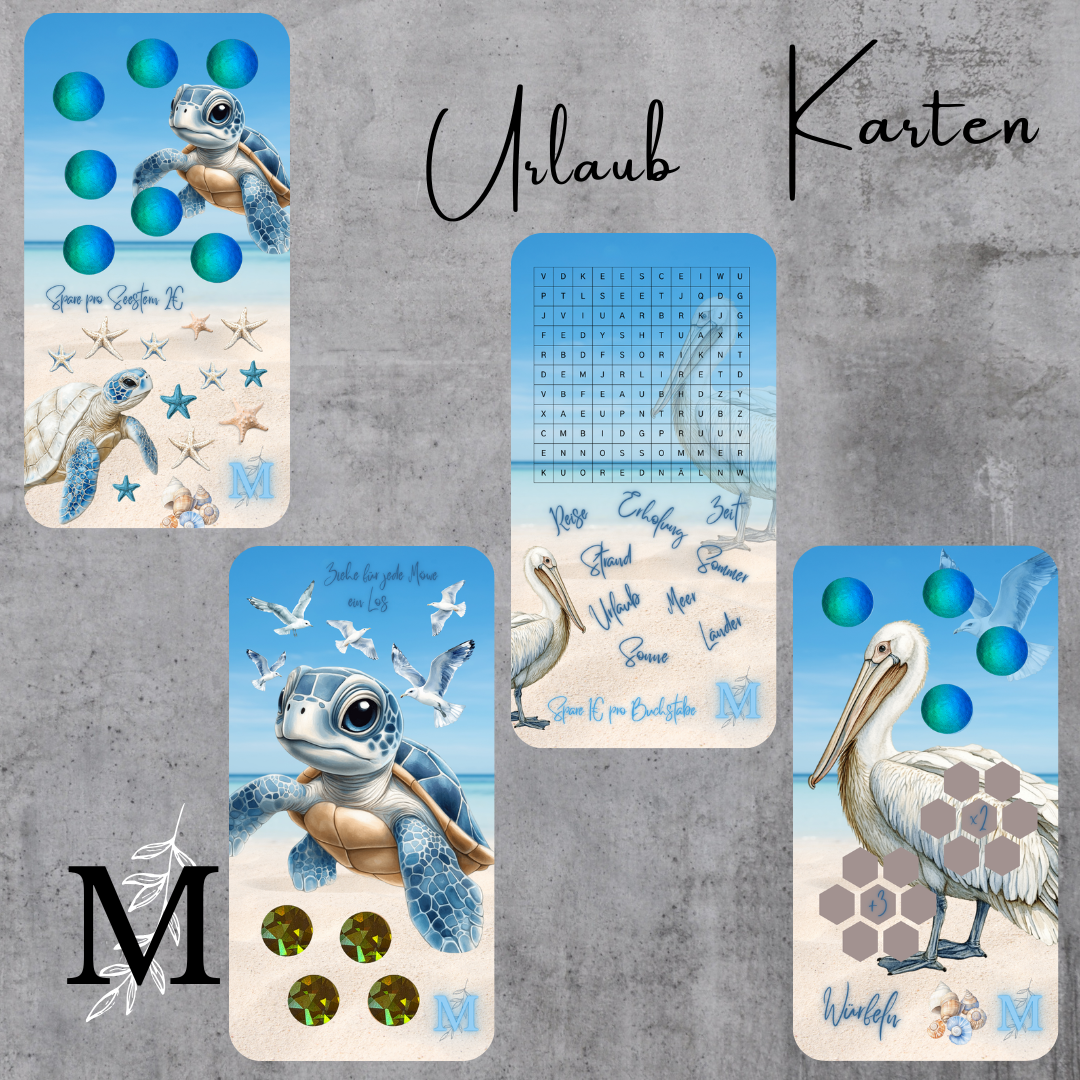 Das Sparspiel „Urlaub“ kommt mit 6 doppelseitig bedruckten Karten. Ihr könnt dieses Spiel als Zufälle nutzen und mit einem 6er Würfel auswürfeln oder ihr bespielt die Challenge die Ihr möchtet.