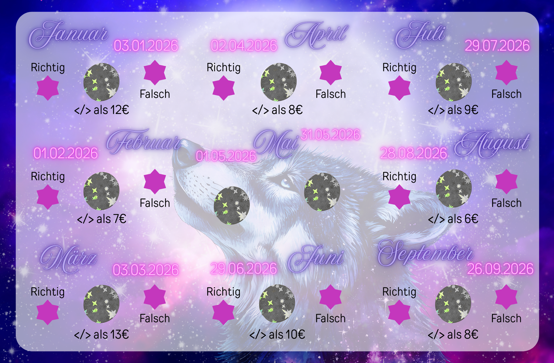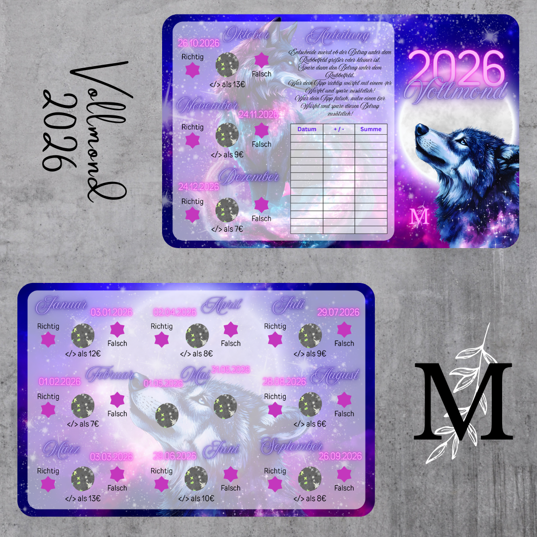 Bei dieser Challenge wird für jeden Vollmond im Jahr 2026 (13 Mal) geraten, gerubbelt und gespart.