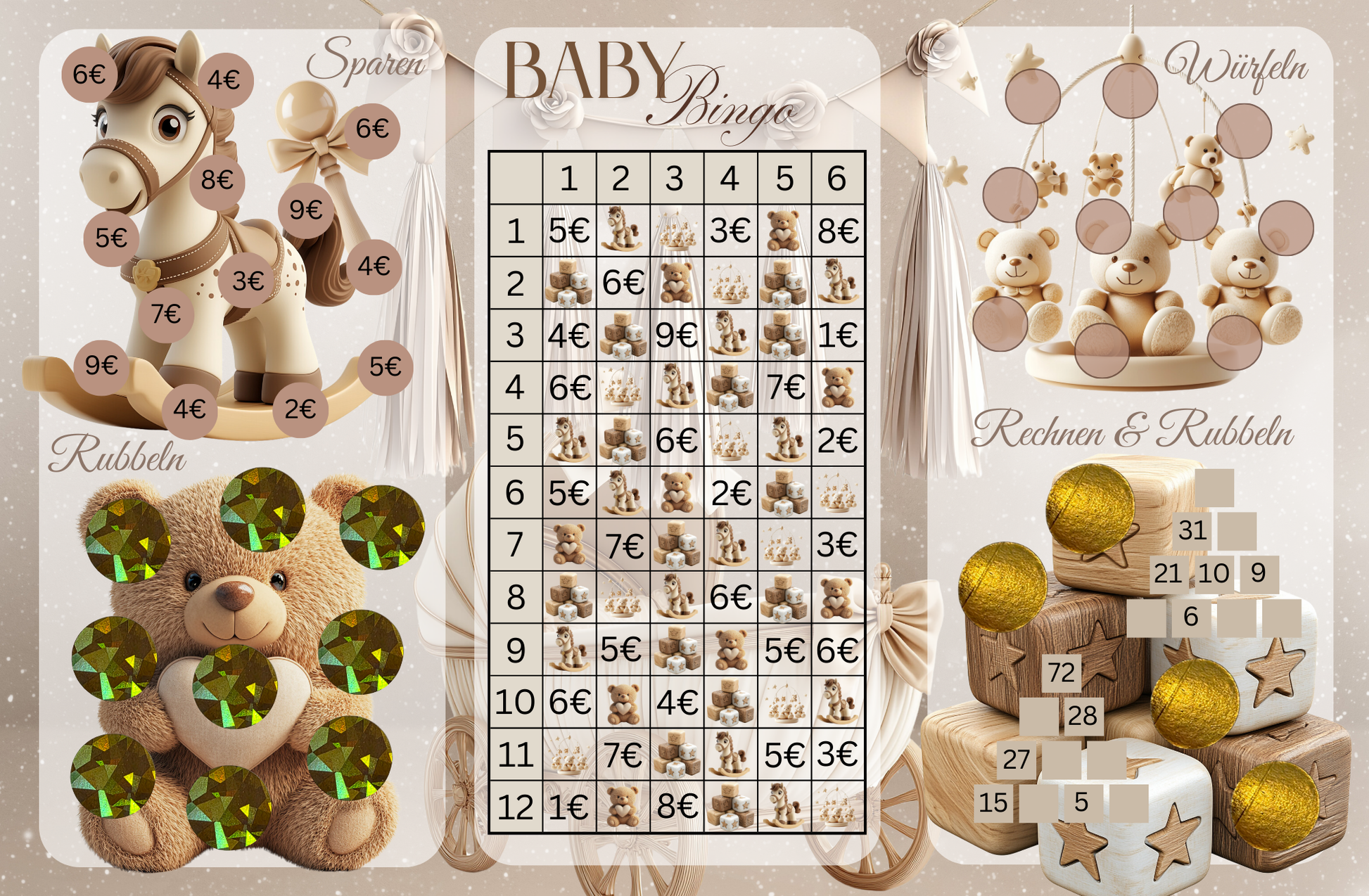 Davon eine Würfelchallenge, eine Rubbelchallenge, ein BabyBingo, eine Rechenchallenge und Sparchallenges.